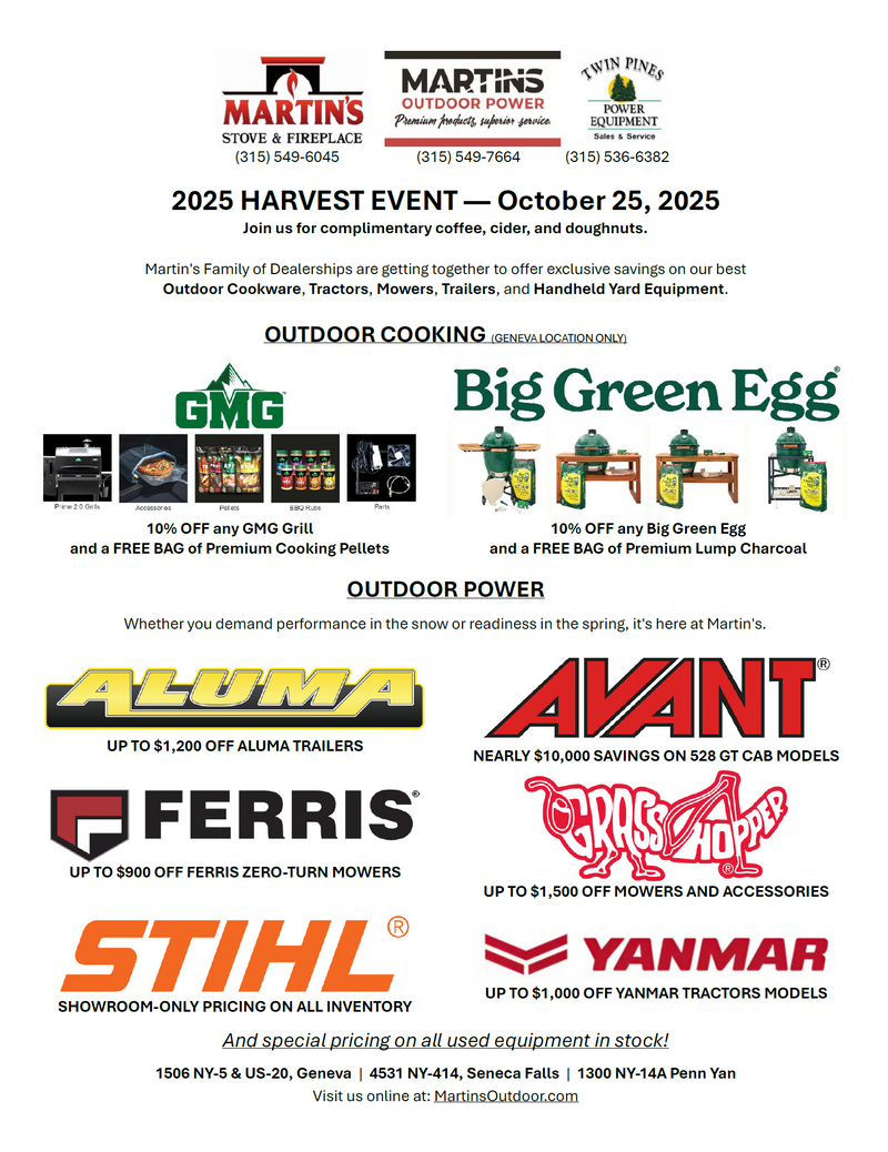 Join us for coffee, cider, and doughnuts from 8 AM to 2 PM in Geneva to browse the showroom inventory of GMG Pellet Grills and Big Green Egg, or any of our three stores to shop our wide selection of outdoor power equipment at event exclusive pricing!