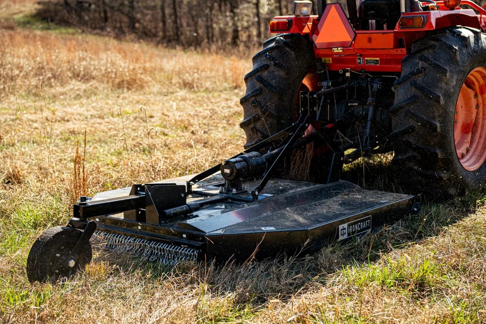 These rotary cutters are designed for standard-duty applications such as weeds, grass, and light brush up to 1.5” in diameter. These cutters are designed to work with 15 to 65 hp tractors, and are available in 48”, 60”, and 72” widths. These cutters use a single spindle with two free-swinging blades, which reduce the shock of impact when a stationary object is contacted. A shear bolt through the input shaft or a slip clutch, if equipped, protects the gearbox and driveline from damage. Standard equipment includes driveline shields and clutch shields.